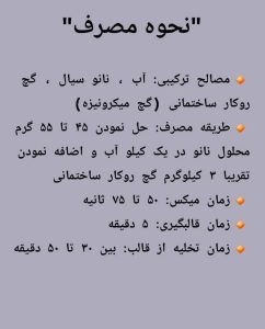- طزیقه مصرف : حل نمودن 45 تا 55 گرم محلول نانو در یک کیلو آب و اضافه نمودن تقریبا 3 کیلوگرم گچ روکار ساختمانی